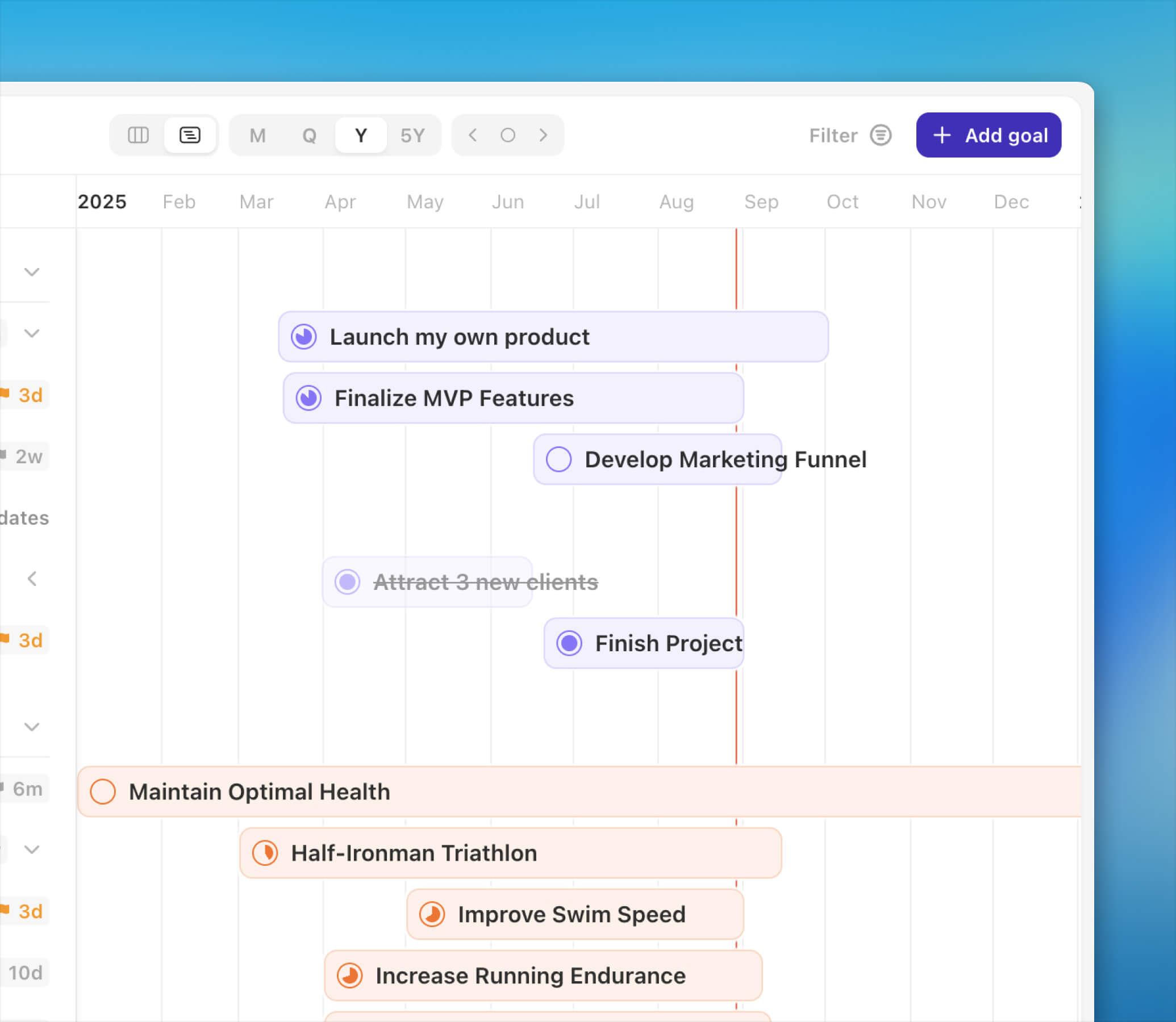 Let your goals flow directly into your calendar. Use time blocking and calendar integrations to build a focused weekly plan that ensures your schedule actually reflects your true priorities.