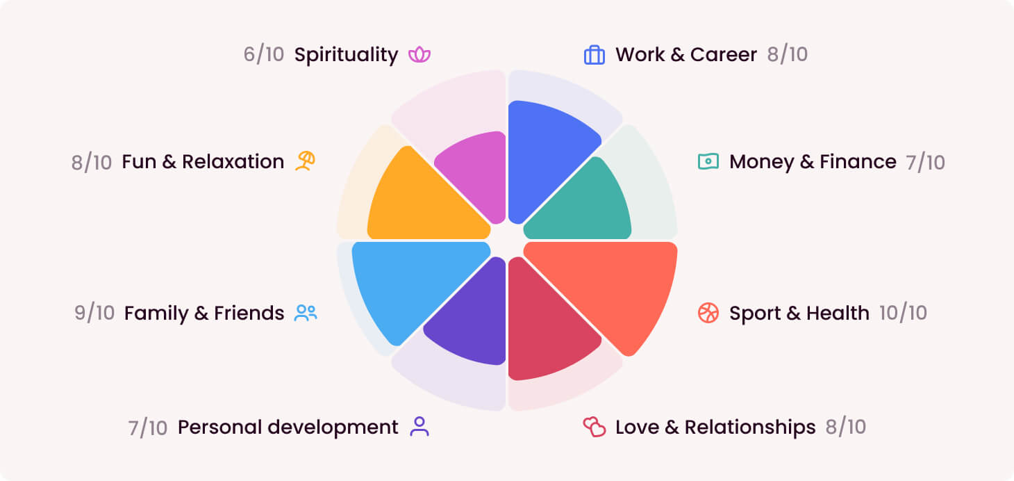 The Wheel of Life is a powerful tool originating from the coaching and personal development field. The purpose of the Wheel of Life is to help you evaluate your current satisfaction or fulfillment for each area of your life. You do this by rating every life area on a scale of 1 to 10. This gives you a bird's-eye view of your whole life, helping you evaluate which aspects need more attention or improvement.