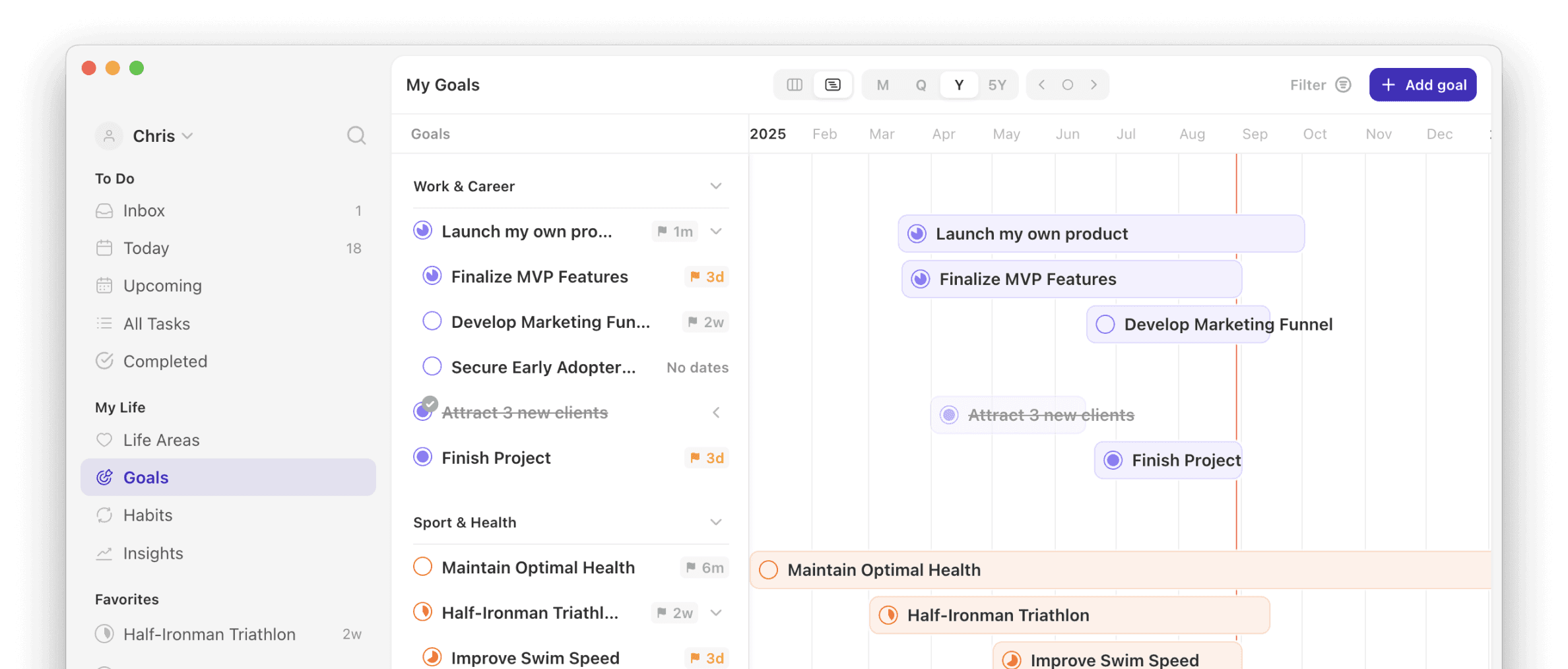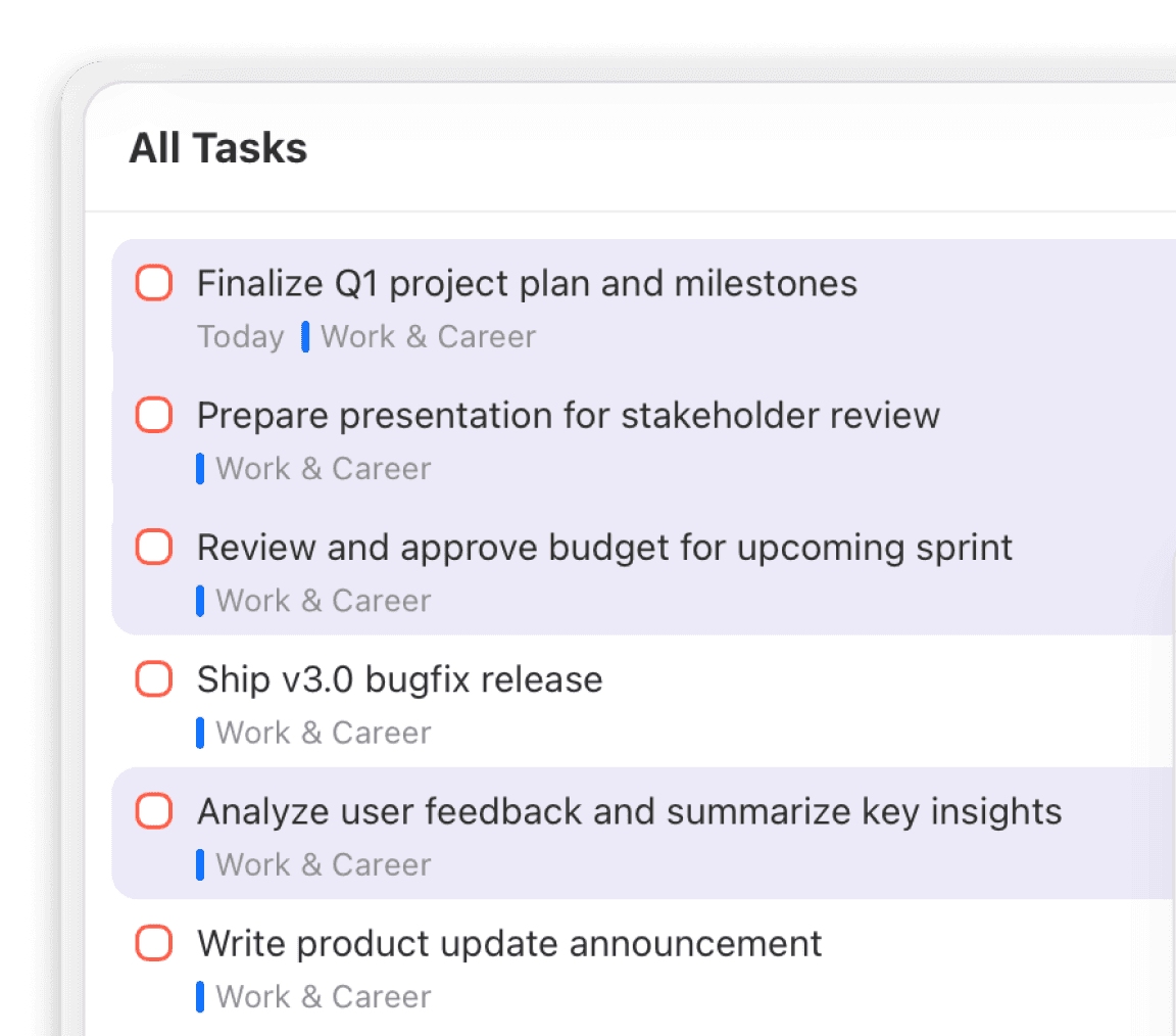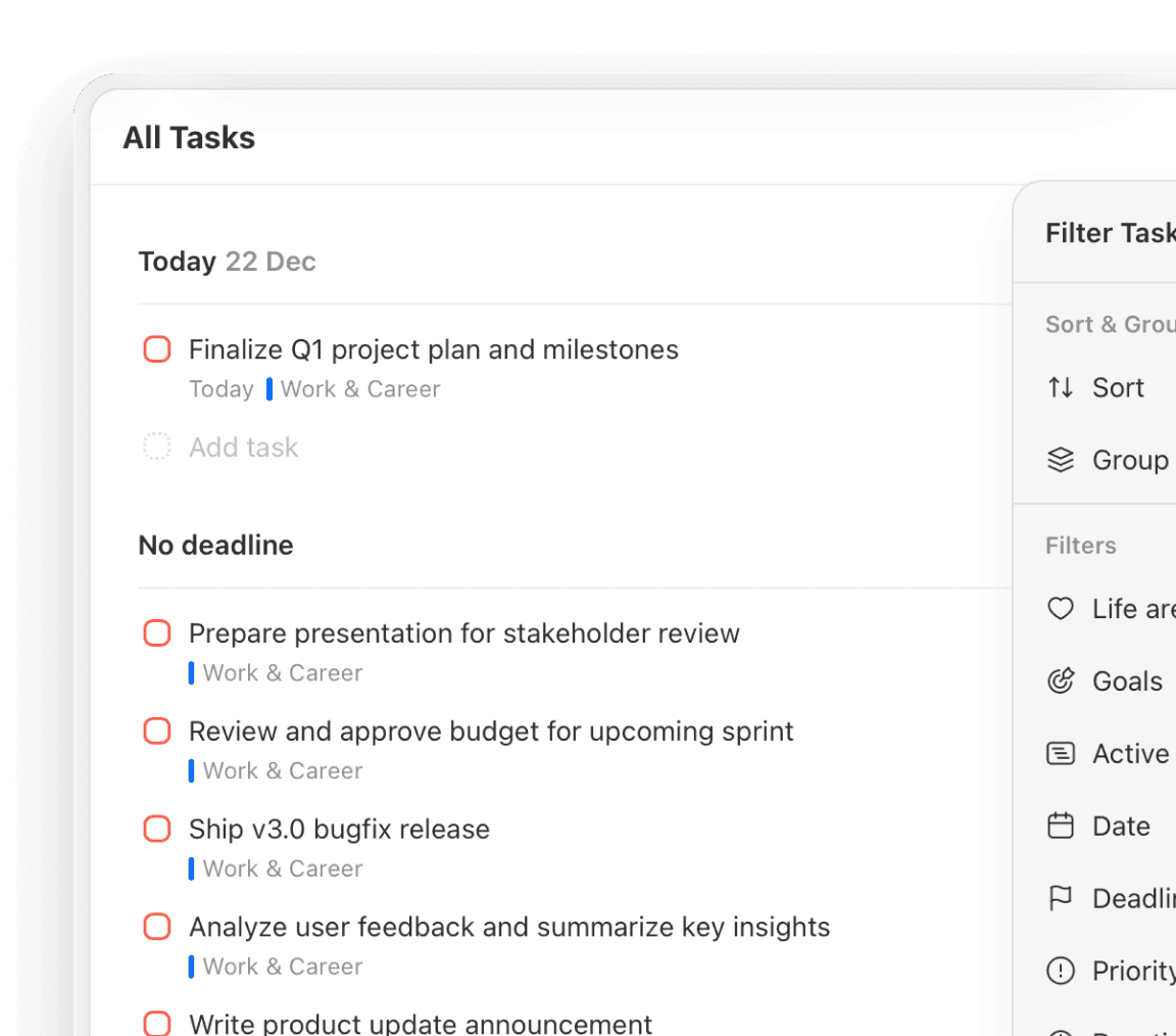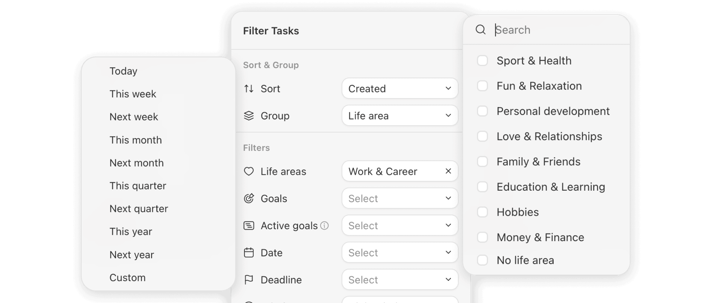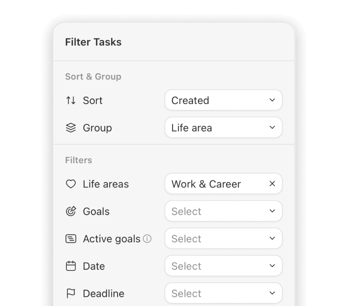 Filters. Quickly narrow down tasks using flexible filters like goal, life area, priority, or date.