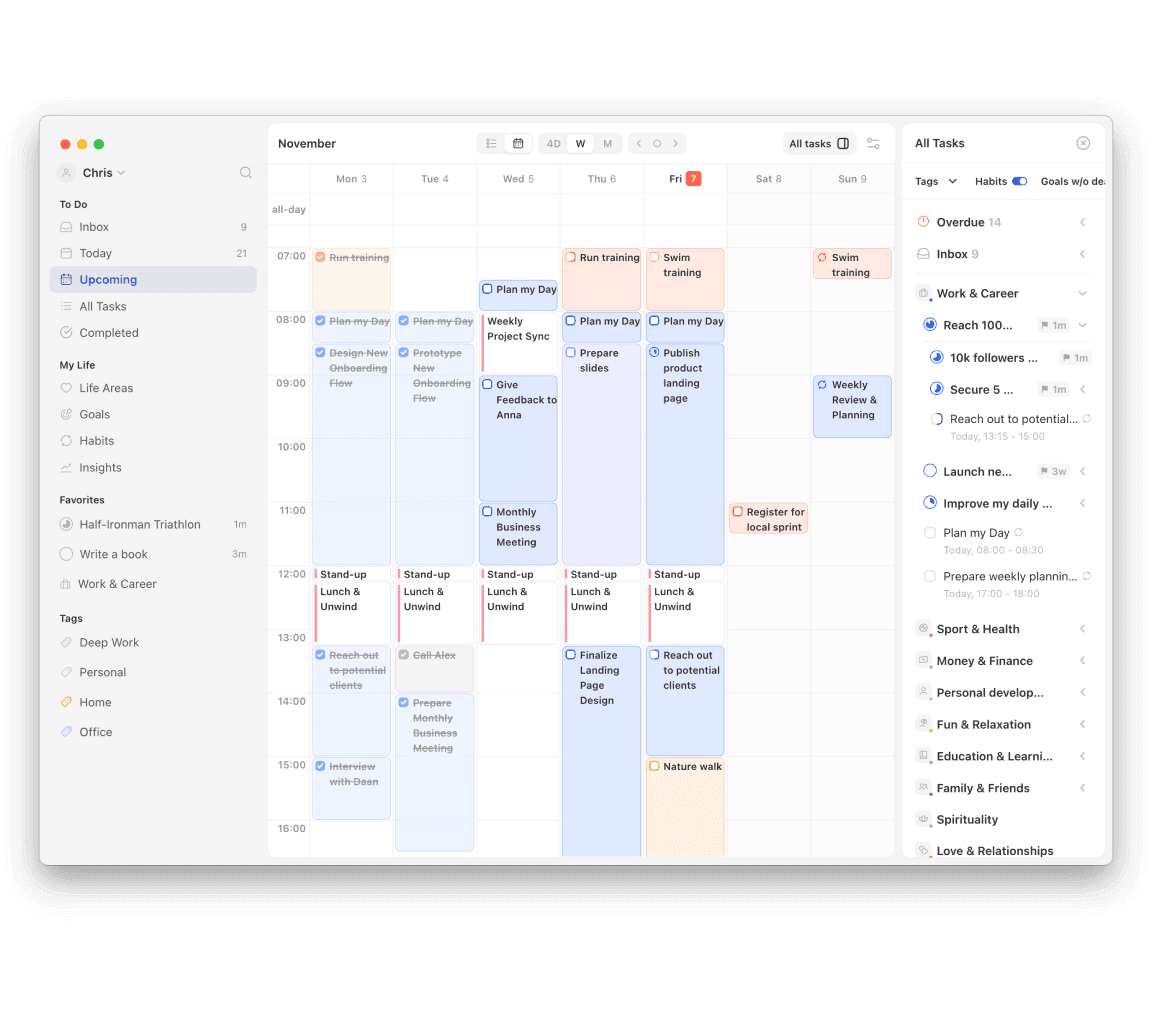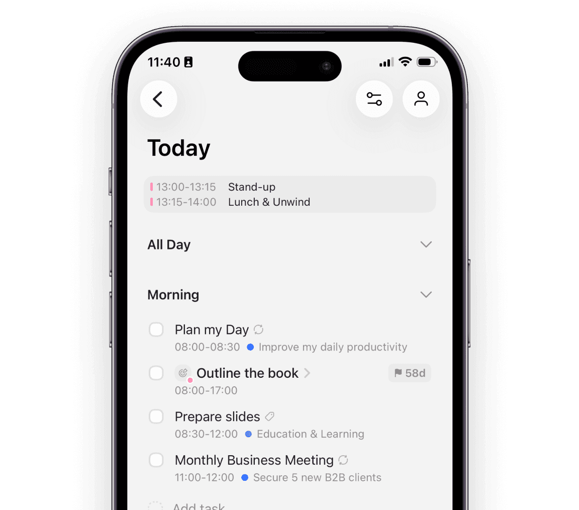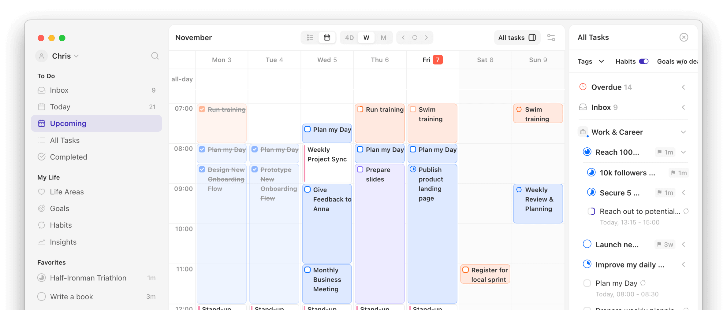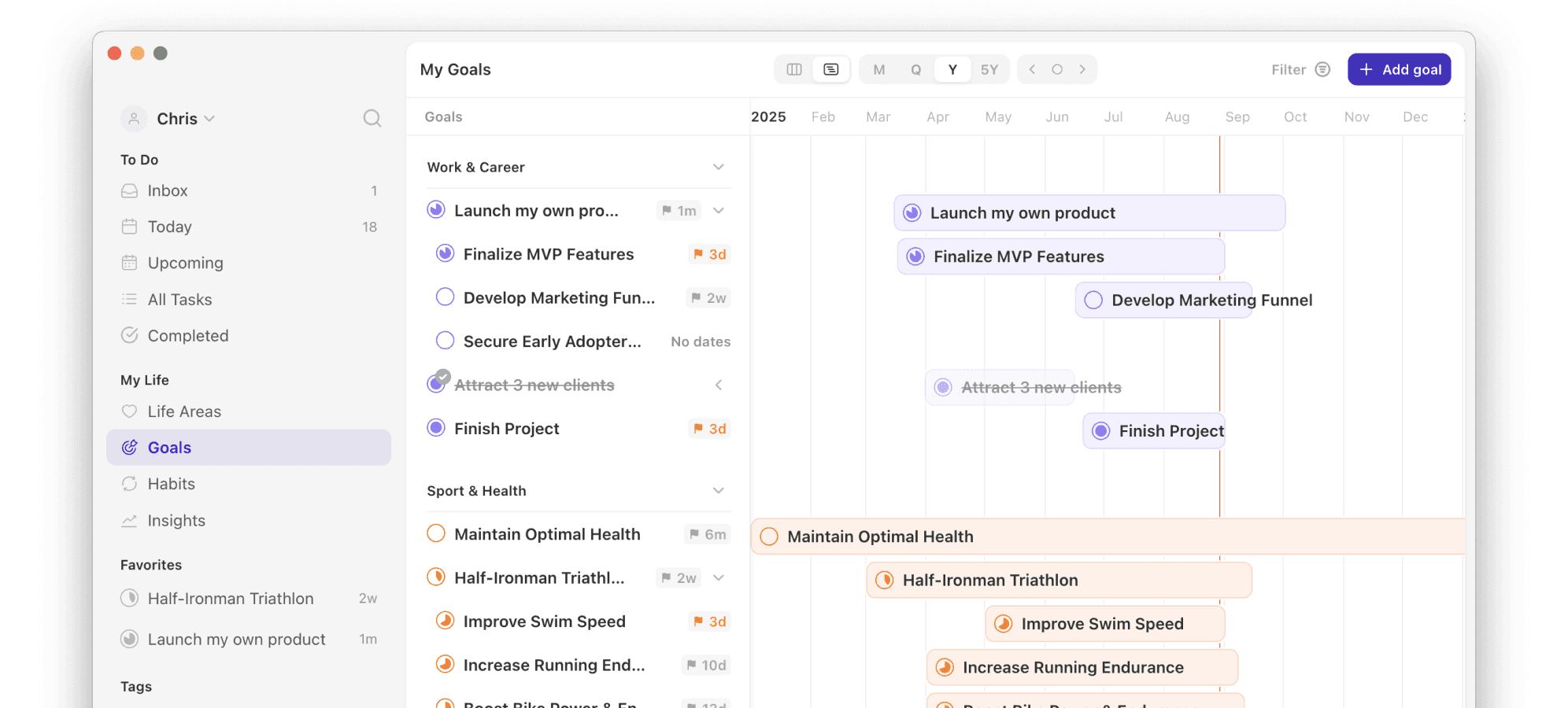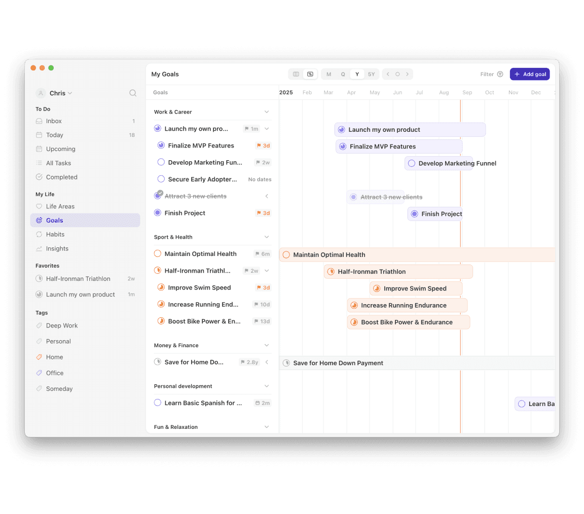 Filters. Quickly narrow down tasks using flexible filters like goal, life area, priority, or date.