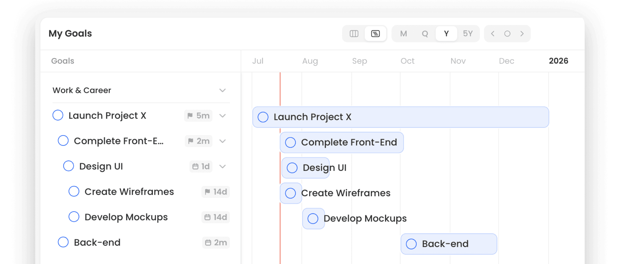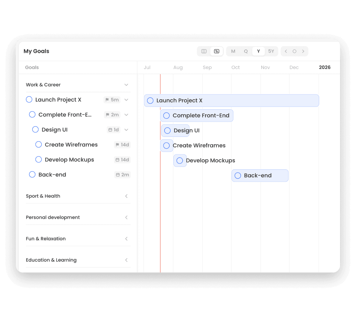 Goal Timeline. Plan your goals for the years ahead on a Gantt-style roadmap.