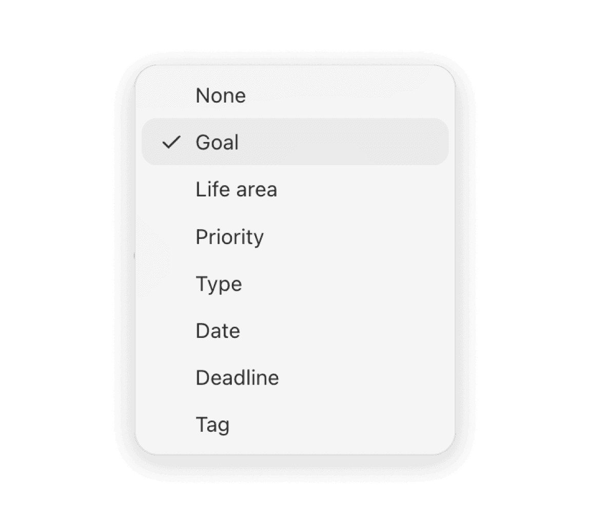 New Grouping and Sorting options. By goal, life area, priority, type, date, deadline, or tag.