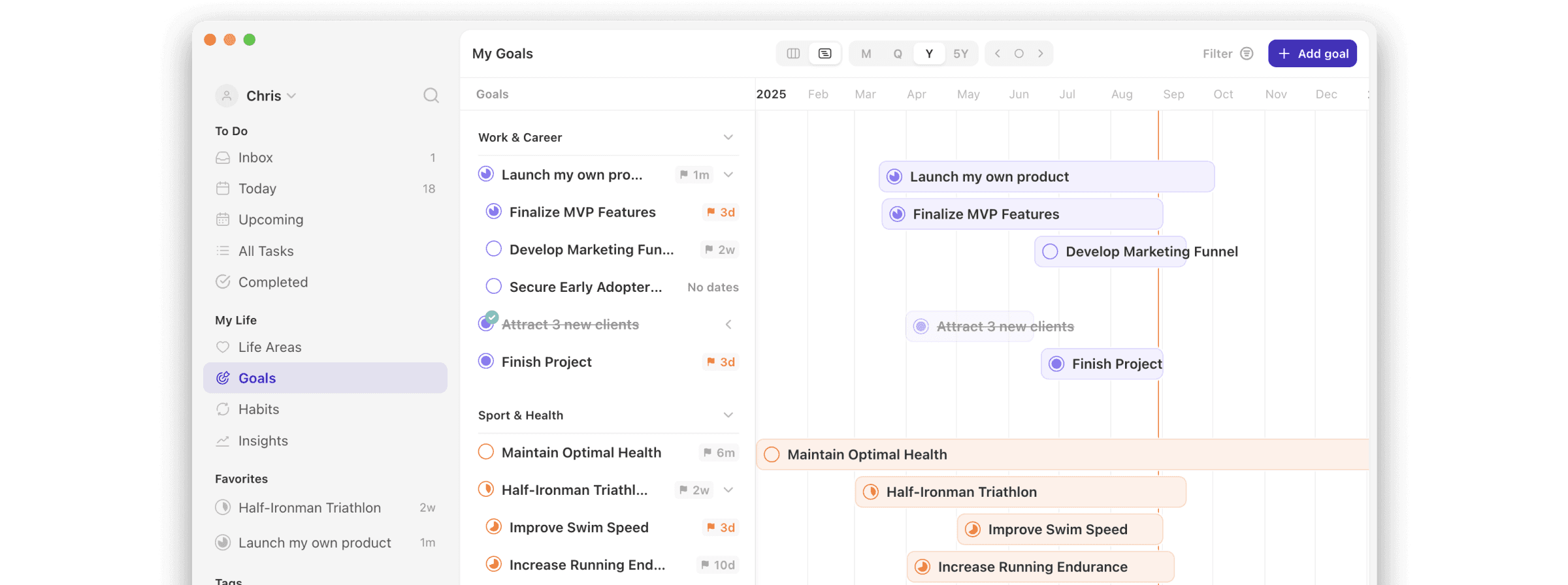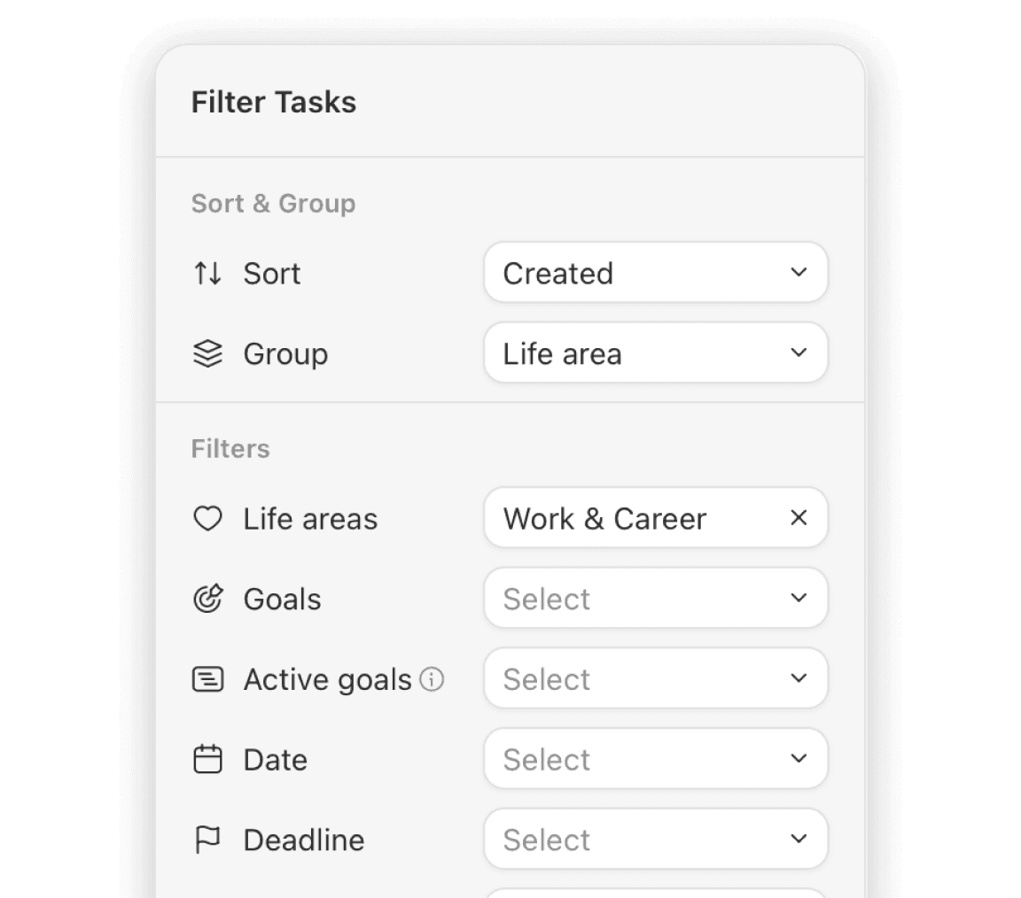 Filters. Quickly narrow down tasks using flexible filters like goal, life area, priority, or date.