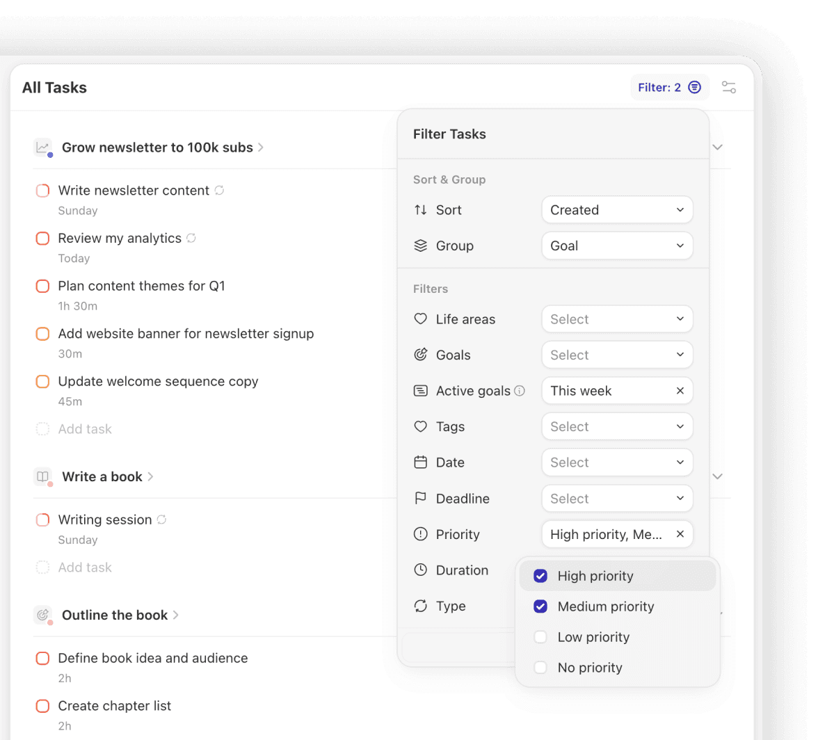 Advanced Filtering: Filter your tasks by Life Area, Goal, Duration, or Priority.