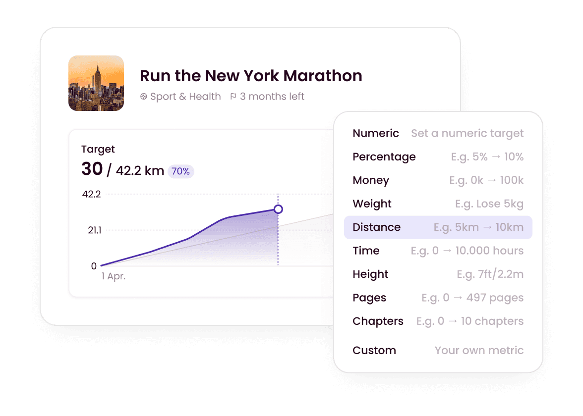 | Progress Tracking | Success Metrics: Track numerical outcomes and results (e.g., revenue, running distance) to measure real progress. | Checkboxes: Completion is tracked via simple project circles and checkboxes. |