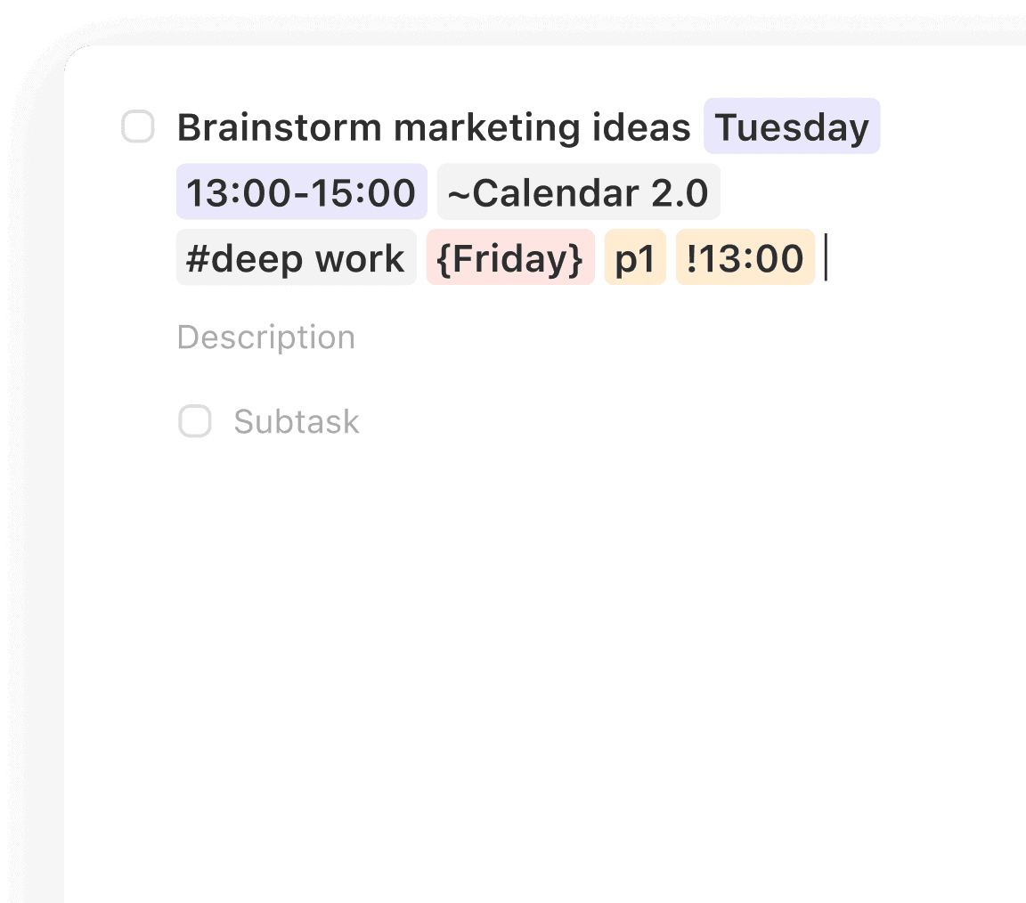 | Task Input | Smart Capture: High-speed Natural Language Processing (NLP) to schedule tasks as fast as you type. | Manual Entry: Relies on manual date pickers and menus for task scheduling. |