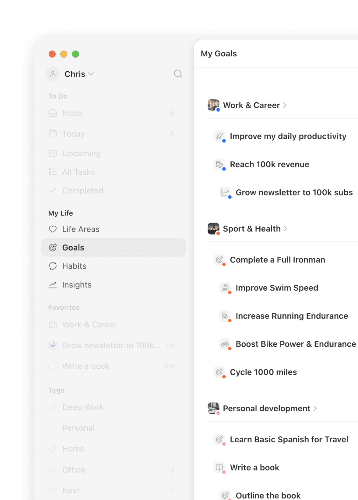 Real life is complex. Griply lets you nest Life Area > Vision > Goal > Subgoal > Task, as deep as you need to go.