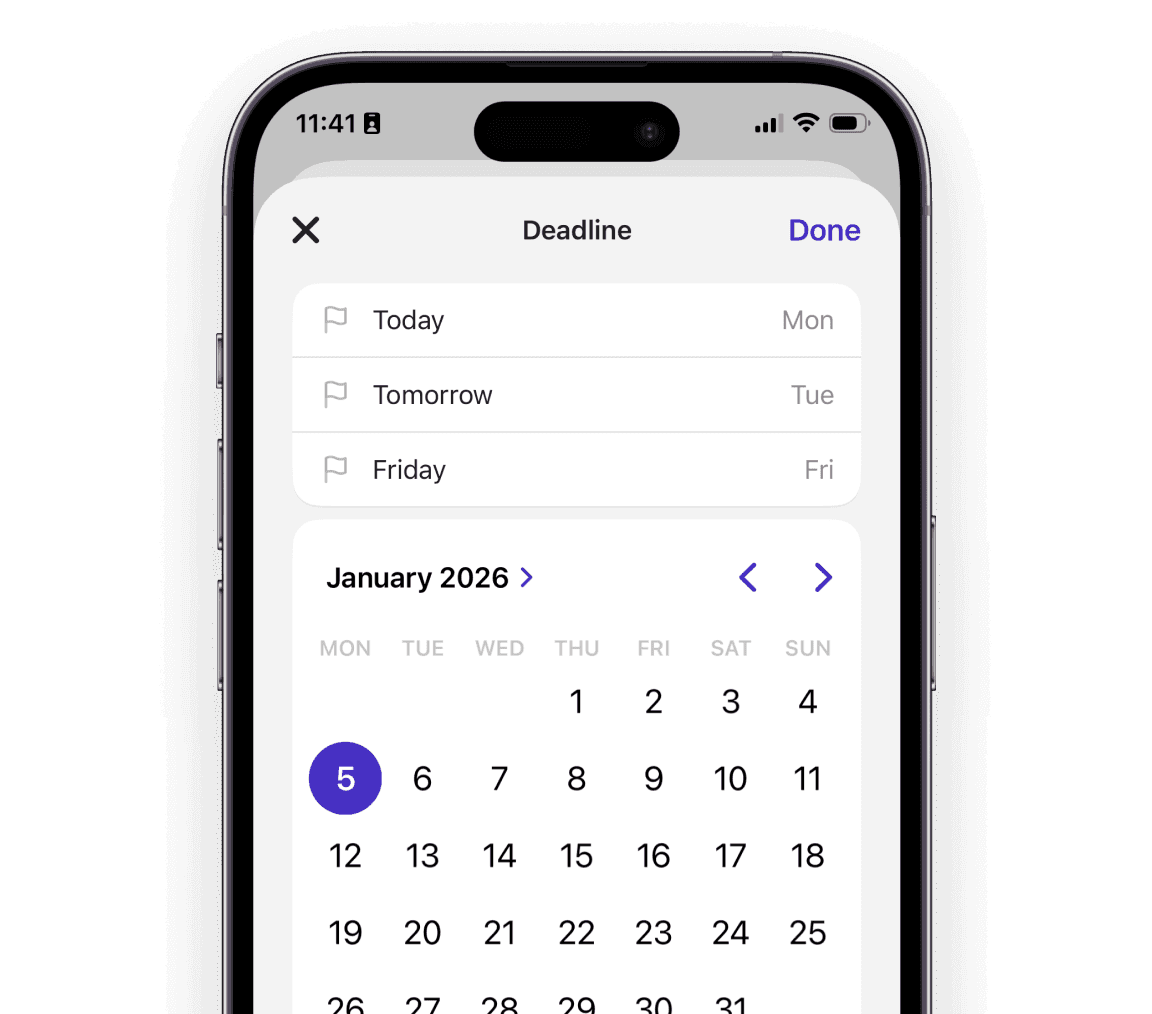 Task Deadlines. Add deadlines to tasks to keep commitments on track.