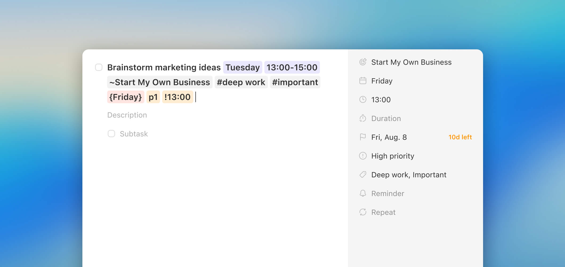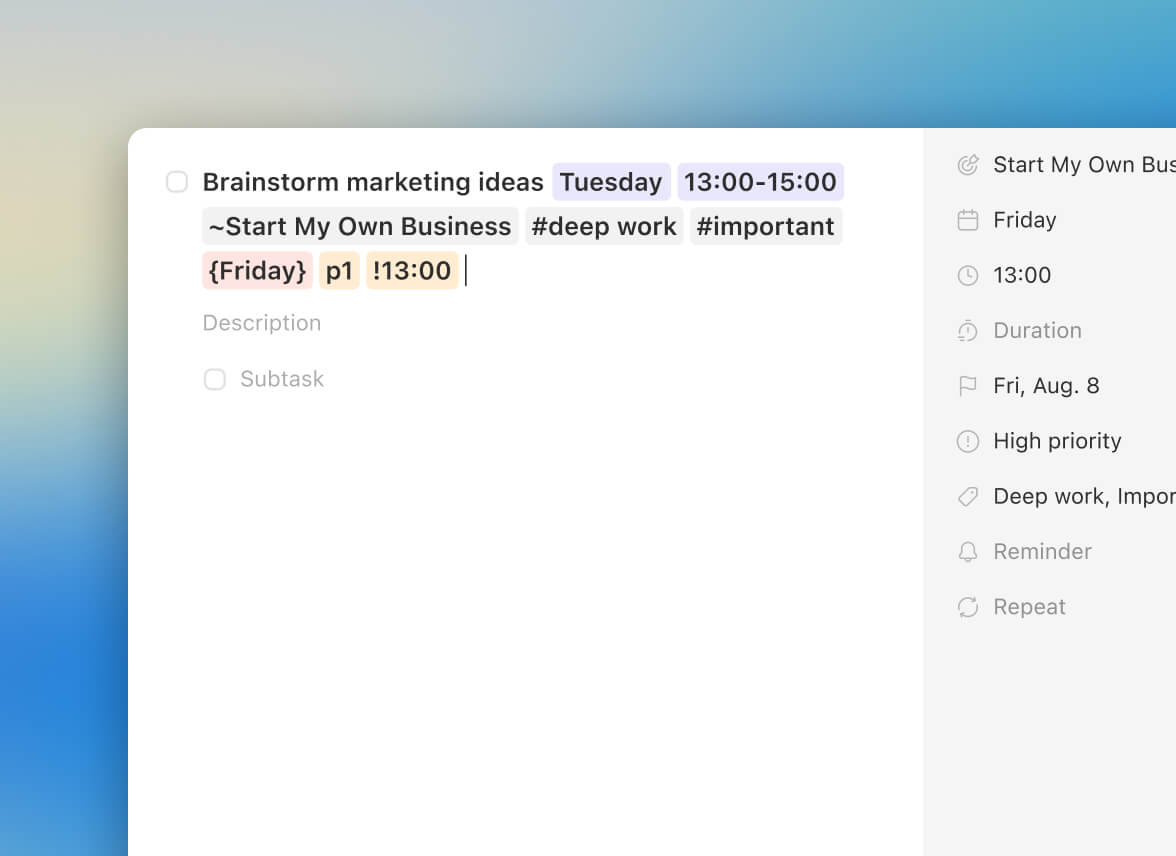 Task Smart Recognition uses plain English to capture tasks purpose-first. Instantly link the task to its core Goal or Life Area, while also setting the due date, time, and tag.