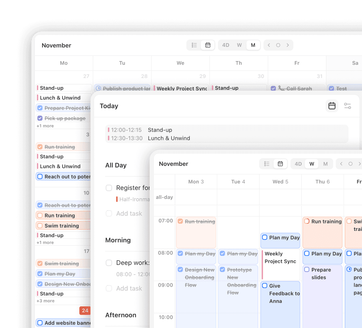 Get total clarity with day, week, and month views. See your high-level deadlines on the monthly view, or get an hour-by-hour plan for your day.