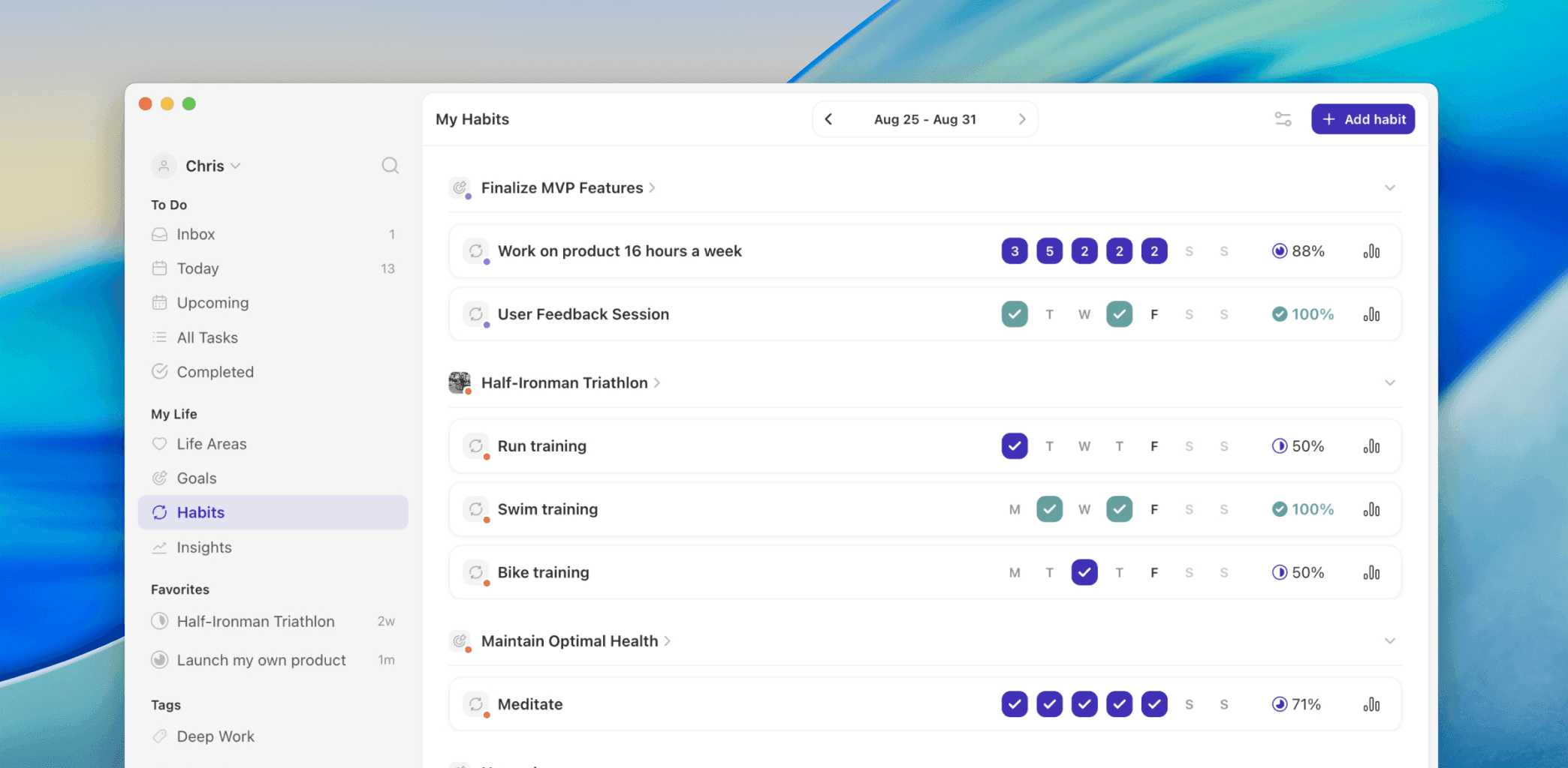 Some habits, like sleep timing or hydration, are worth tracking as standalone health practices. But for habits you struggle to maintain, the goal connection is often the missing piece. Seeing that a habit feeds a goal you care about gives you a reason to return after you break the streak.