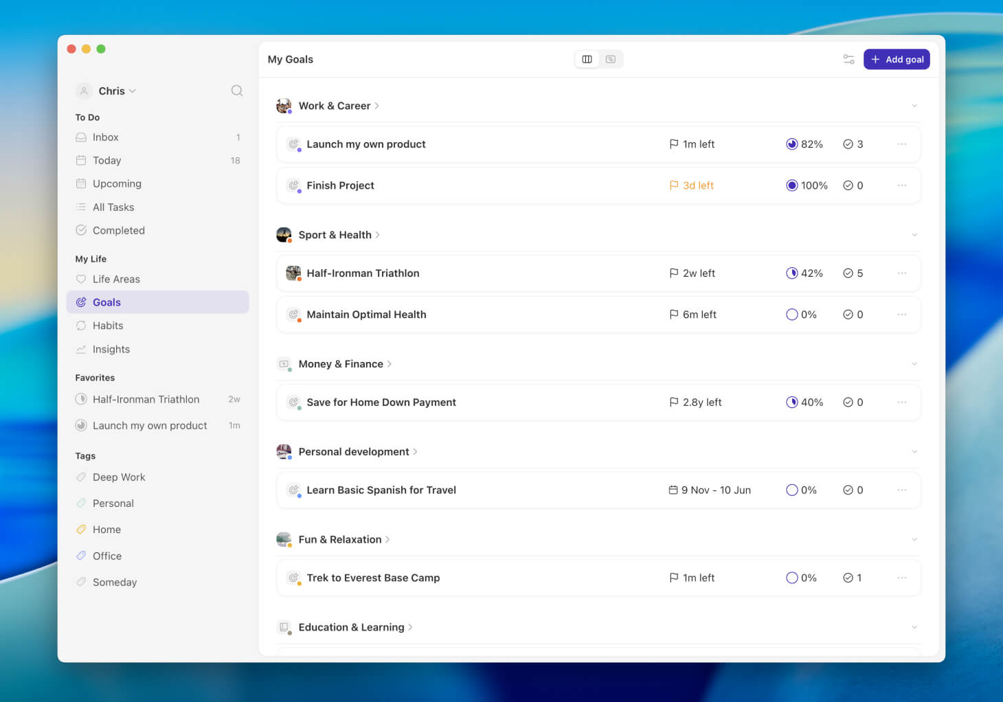Life areas are the foundation of your system in Griply. They represent the main parts of your life and help you keep your goals balanced.