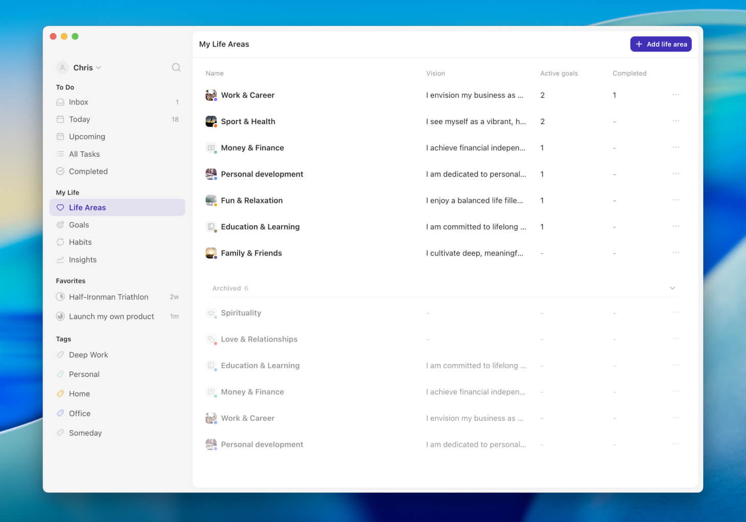 Once your life areas reflect your actual life, reorder them so your most important life area for 2026 is at the top. This makes your priorities visible every time you open the app and subtly guides your focus throughout the year.