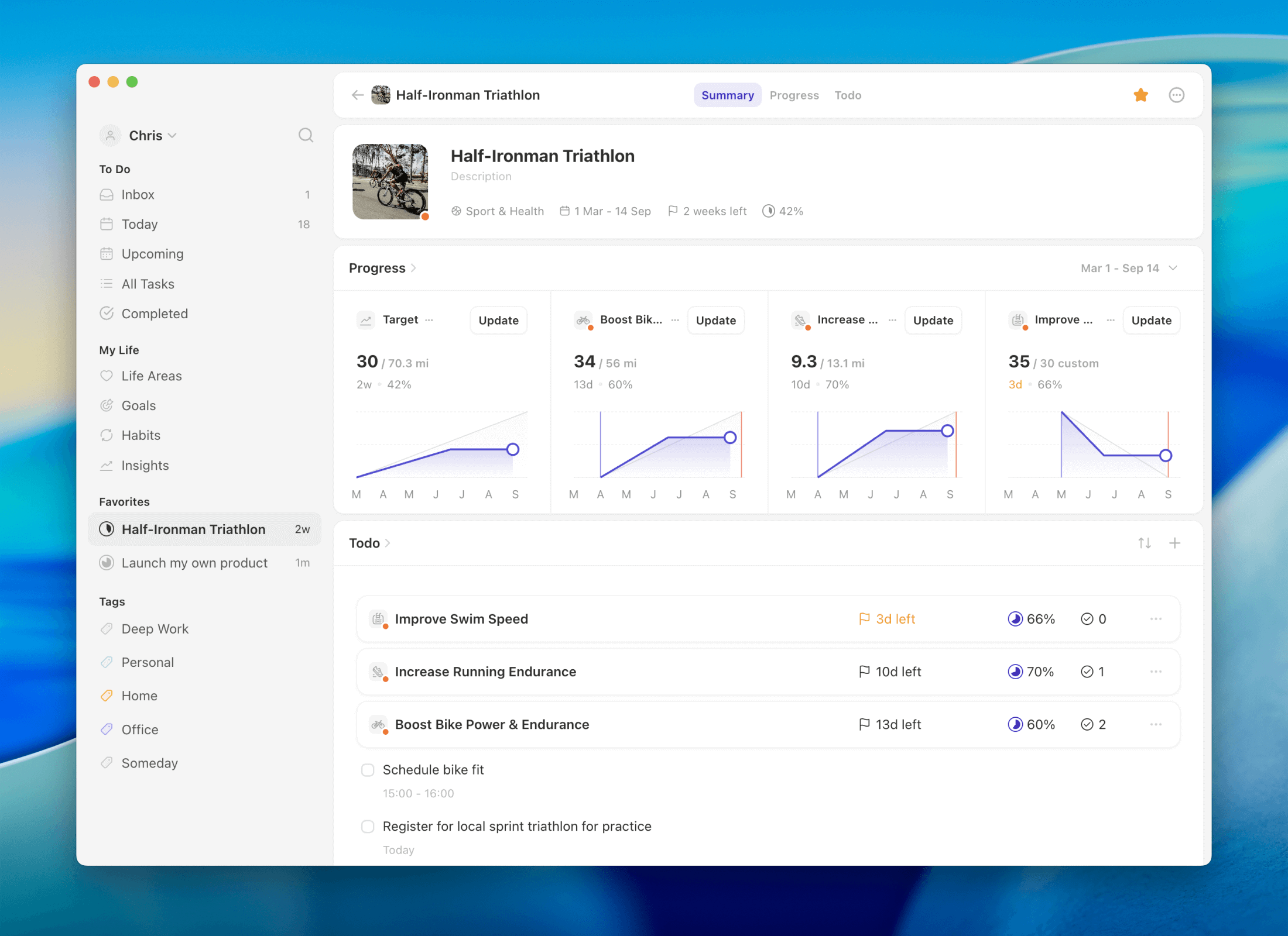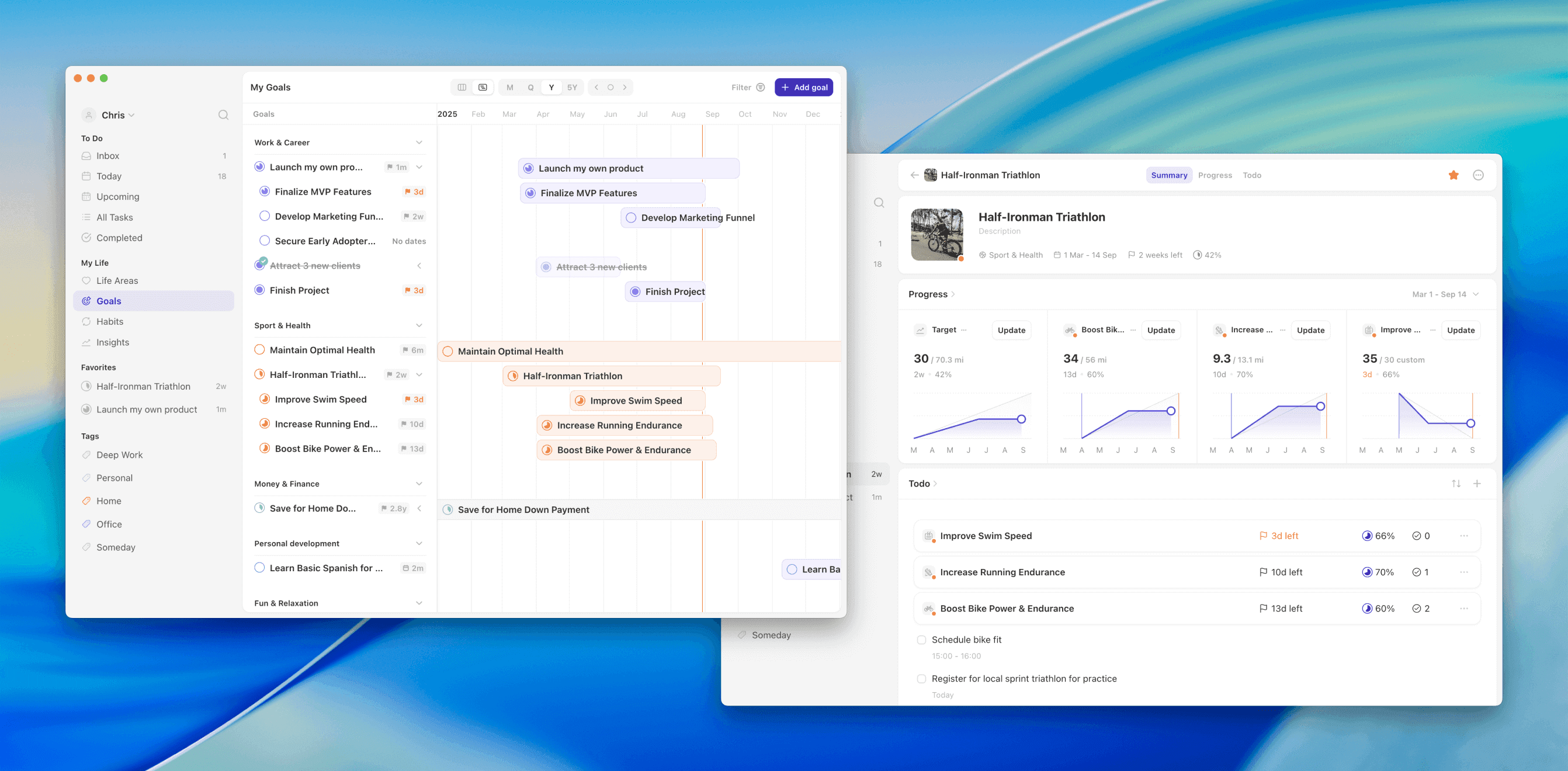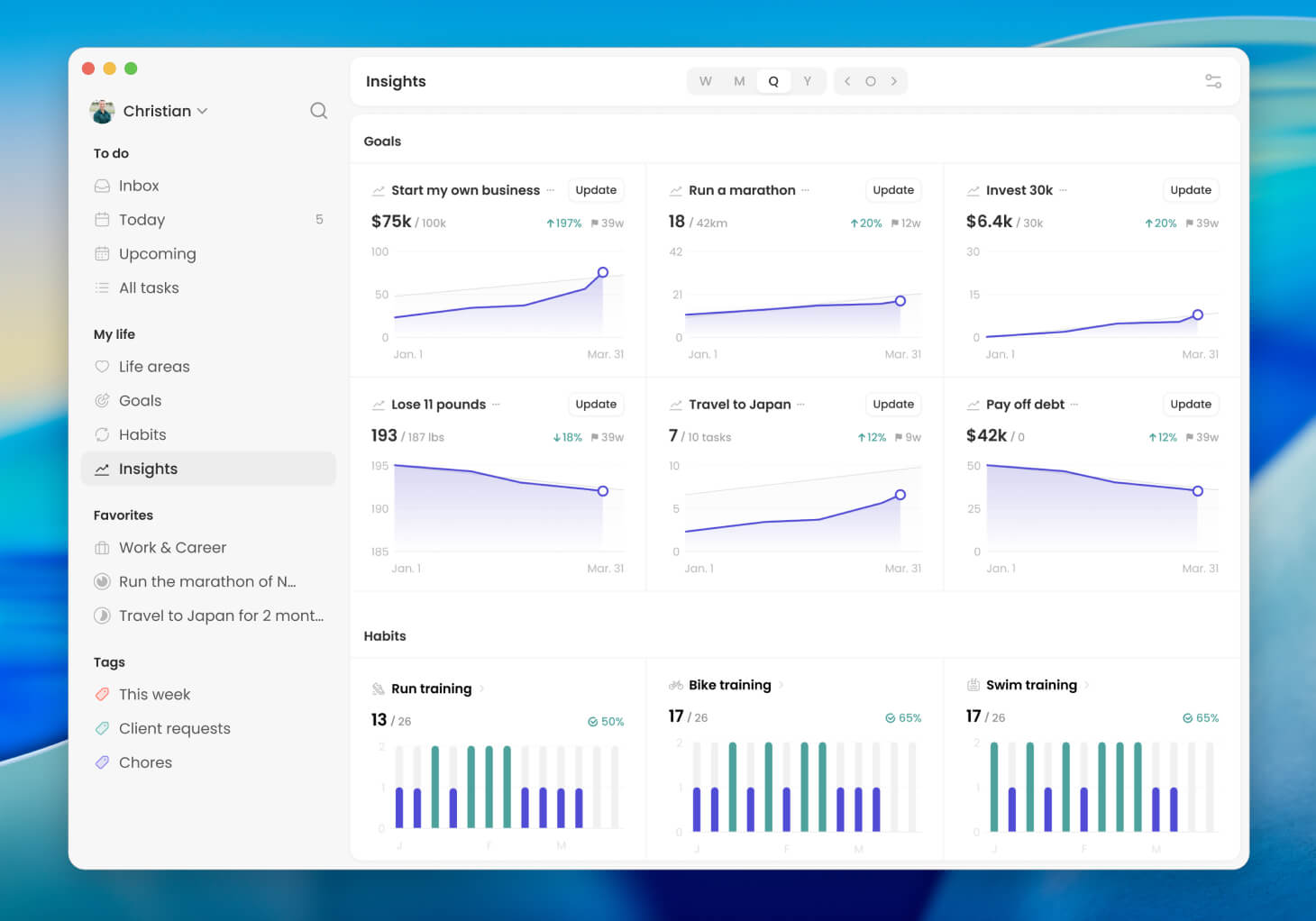 During your reviews, open the Insights view to get a clear overview of how your goals and habits are progressing over time.